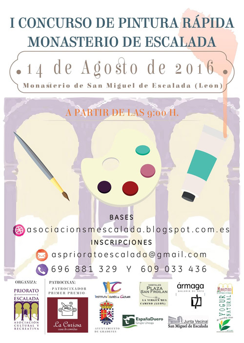 La asociación cultural y recreativa «Priorato de Escalada» convoca el I Premio de Pintura Rápida «Monasterio de Escalada» que tendrá lugar el domingo 14 de agosto en el entorno de monasterio mozárabe ubicado en la localidad leonesa de San Miguel de Escalada. Habrá dos premios, uno de 800 euros y otro de 500 euros. Estas son las bases:
