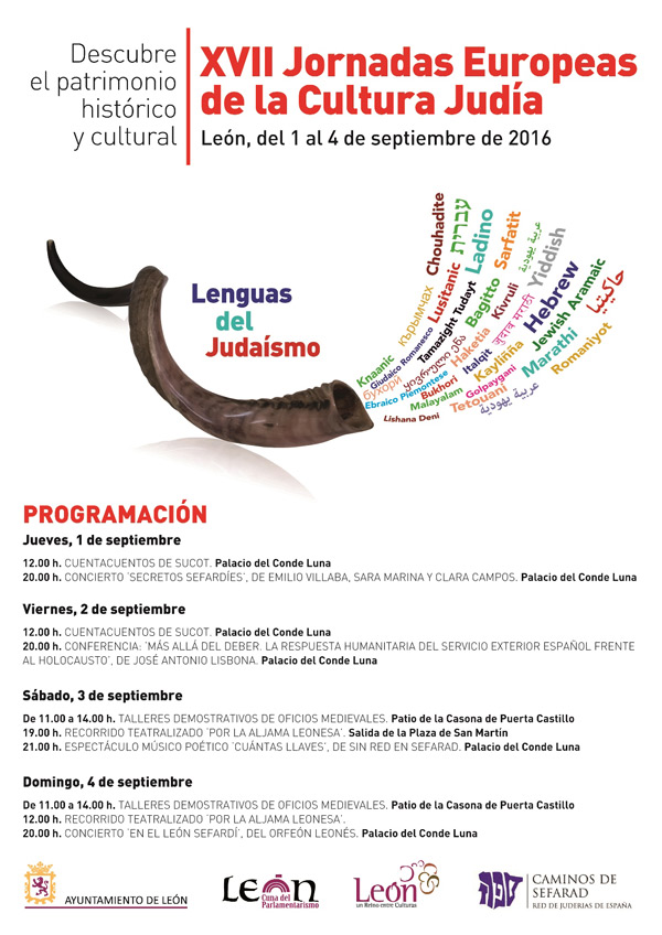 Organizadas por la Concejalía de Cultura del Ayuntamiento de León, las jornadas se desarrollarán entre el 1 y el 4 de septiembre. Este año están dedicadas a las lenguas del judaísmo e incluyen actividades multidisciplinares. El objetivo: promocionar y colaborar en la preservación del patrimonio judío como parte del proyecto integral del patrimonio cultural europeo.