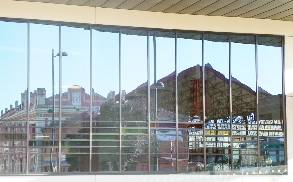 Las peligrosas imágenes potenciales: desde cierto ángulo, la marquesina decimonónica de la vieja estación del tren se refleja en la fachada de la nueva. Ahora es ya una estación virtual. Es un fenómeno que he contemplado más de una vez.