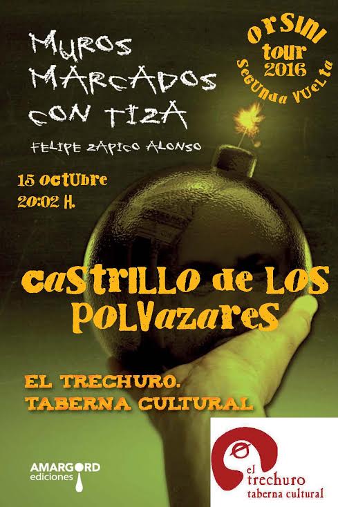 El sábado 15 de octubre el poeta Felipe Zapico celebrará la última presentación de la primera edición de su libro Muros marcados con tiza (Editorial Amargord), su libro-bomba, con un recital en la Taberna El Trechuro de Castrillo de los Polvazares (León), a las 20:02 horas. «Agotada la primera edición de 500 ejemplares», comenta, «ya está en imprenta la segunda edición».