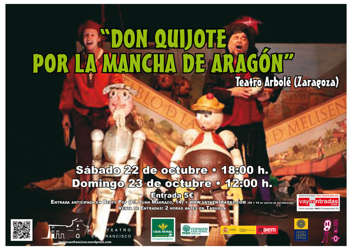 Y el sábado 22 de octubre (18 horas) y el domingo 23 (12 horas), teatro para público familiar con las marionetas de Teatro Arbolé y la obra «Don Quijote por la Mancha de Aragón». Entradas a 5 euros.