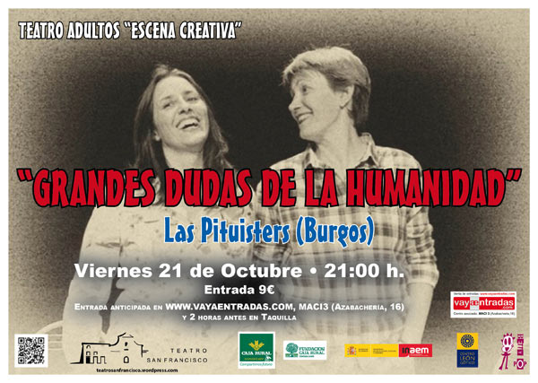 Las Pituisters abren el ciclo de teatro para adultos «Escena creativa» en el Teatro San Francisco (León), con su obra de humor «Grandes dudas de la Humanidad». Será este viernes, 21 de octubre, a las 21 horas. Entradas a 9 euros.