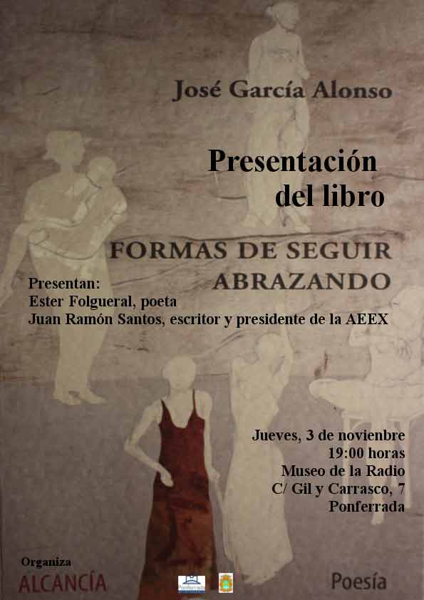 El jueves, 3 de noviembre, a las 19:00 horas, se presentará en el Museo de la Radio (C/ Gil y Carrasco 7, Ponferrada) el libro «Formas de seguir abrazando», del que es autor José García Alonso (Pombriego, León, 1962). El libro ha sido publicado por Alcancía en su colección Alcancía/Poesía. Además del autor, participarán en el acto la poeta berciana Ester Folgueral y el escritor, y presidente de la Asociación de Escritores Extremeños (AEEX), Juan Ramón Santos.