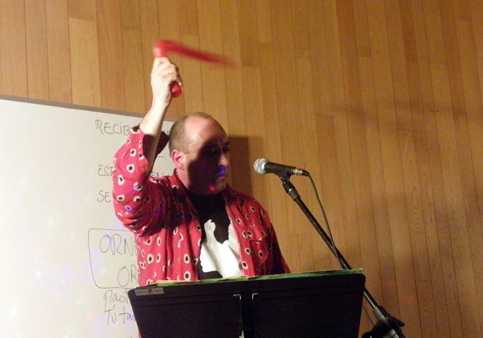 12-pel-44 3 de noviembre de 2016 Return to: UROGALLO / Crónica / «Apuntes» sobre el I Festival de Poesía ExpandidaMáxima resolución (700 × 491) Image navigation Previous Image Siguiente imagen "Ornette, pastel de pájaro". Actuación de Pelayo Arrizabalaga y Víctor M. Díez. Foto: E. Otero.