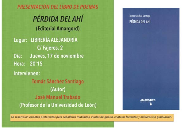 El escritor Tomás Sánchez Santiago presenta este jueves 17 de noviembre, en León, su nuevo poemario, «Pérdida del ahí» (Ed. Amargord). Será en la librería Alejandría (calle Fajeros, 2), a las 20,15 horas, en un acto en el que estará acompañado por el profesor universitario José Manuel Trabado.