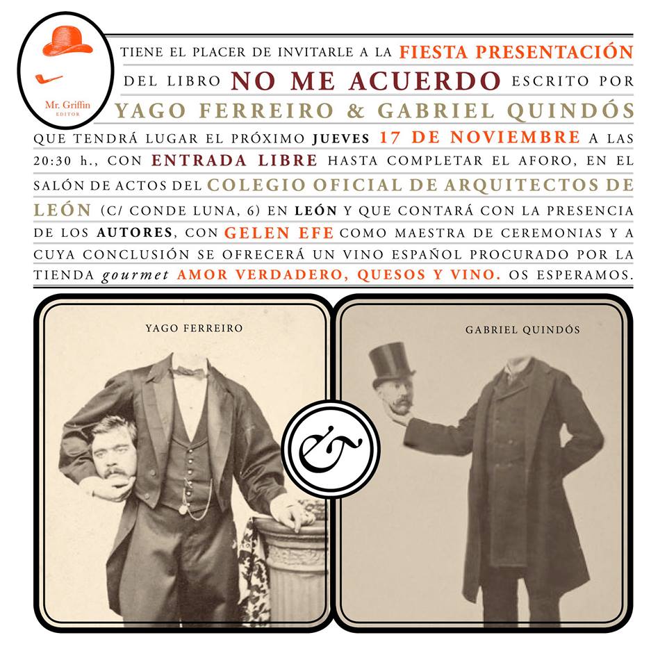 El libro «No me acuerdo», escrito por los autores leoneses Yago Ferreiro y Gabriel Quindós y editado por Mr Griffin,  se presentará el jueves 17 de noviembre con una fiesta llena de sorpresas en el Palacio de Gaviria (COAL, C/ Conde Luna, 3), en León. Será entre las 20.30 y las 23 horas.