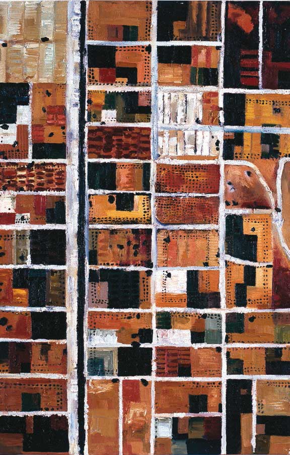 La obra presente en la muestra es una pintura como boceto de la cartografía de un paisaje, donde la artista imprime su estado más íntimo, sus pensamientos y sentimientos, invitándonos a descubrir su paisaje interior. La seriación de manchas sobre el fondo aparentemente uniforme, acentúan la austeridad de las sólidas bases. En esta obra la artista juega con planos de color, manchas perfectamente acotadas que nos remiten a referentes cartográficos. La dialéctica entre los colores planos y la caligrafía sutil, muestran una geografía o mapa desde una perspectiva aérea donde los planos aparecen como estratos de la imagen.