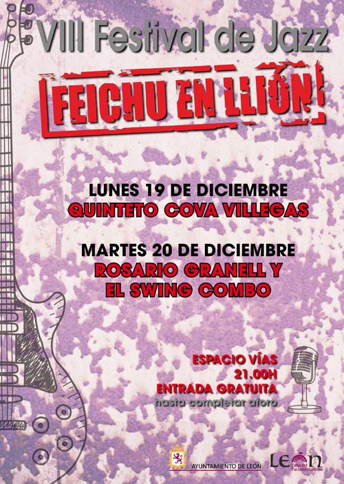 Dos estupendos grupos locales protagonizan las dos únicas funciones del Festival de Jazz «Feichu en Llión»: Quinteto Cova Villegas, el lunes 19 de diciembre, y Rosario Granell y el Swing Combo, el martes 20 de diciembre. Ambos conciertos serán a las 21 horas en el Espacio Vías (Avda. Padre Isla nº 48). La entrada será libre hasta completar aforo y las puertas se abrirán 15 minutos antes del concierto.