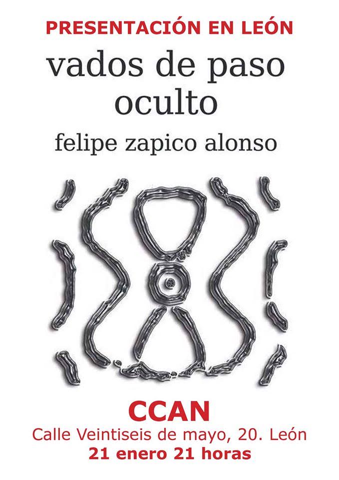 El CCAN leonés (calle 26 de Mayo, 20) acoge este sábado 21 de enero, a las 21.00 horas, la presentación del último poemario del polifacético creador Felipe Zapico Alonso, «Vados de paso oculto», obra editada por Crecida de Poesía (Ahora Wanceulen/Libros del Estraperlo) que forma parte de la serie Libros del estraperlo, en la que participan autores nacidos o residentes en la Ribera del Guadiana (Zapico, que es leonés, reside en Badajoz, aparece y desaparece como el Guadiana y en cualquier momento, además, puede aparecer en cualquier sitio de España y/o Portugal y desparecer después).
