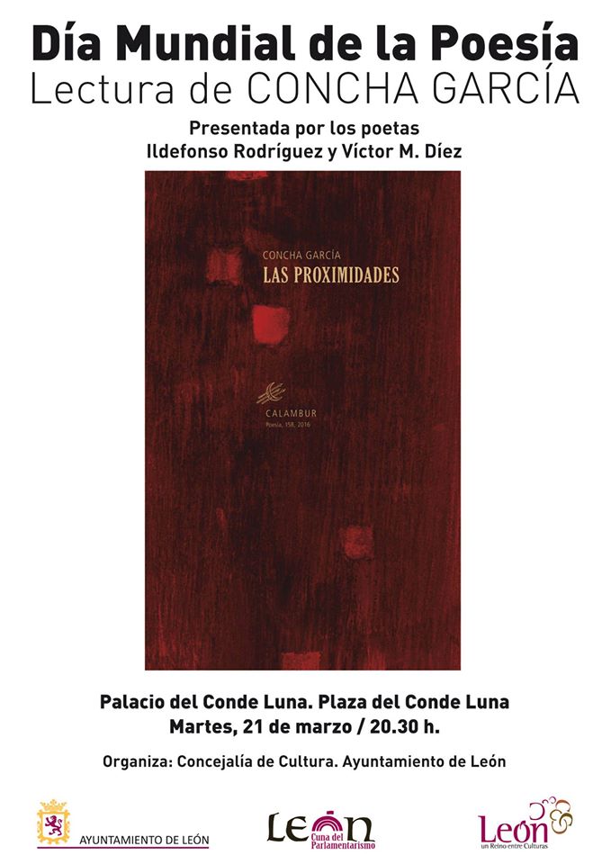 El martes 21 de marzo, Día Mundial de la Poesía, a las 20:30 horas, el Palacio del Conde Luna (en León) acogerá una lectura del poemario de Concha García «Las proximidades» (Ed. Calambur), a cargo de su autora. Presentarán el acto Ildefonso Rodríguez y Víctor M. Díez. El acto está organizado por la Concejalía de Cultura del Ayuntamiento de León. Entrada libre.
