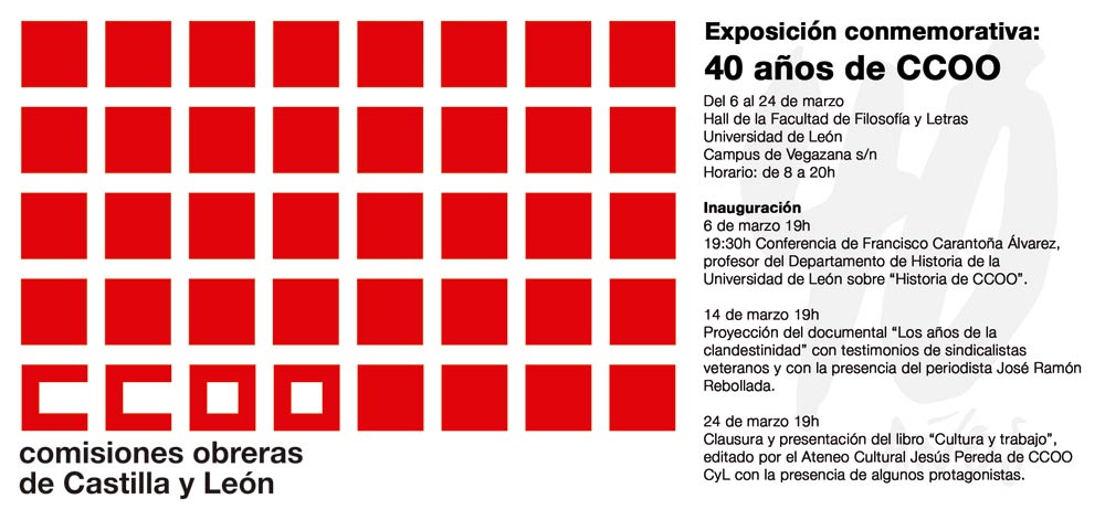 Con este acto se pone fin a la conmemoración del 40 aniversario de la legalización de CCOO, para lo que se ha contado con una exposición, que se ha podido contemplar en el hall de la Facultad de Filosofía y Letras, una conferencia del profesor Francisco Carantoña y la proyección de un documental sobre los años de la clandestinidad.