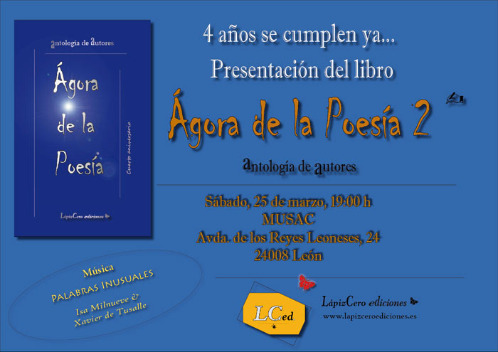 De la mano de Xavier de Tusalle —escritor, músico y editor de LápizCero ediciones— y coordinado por Ramiro Pinto —escritor y uno de los fundadores del Ágora— nace el segundo libro Ágora de la Poesía 2 —el primero se lanzó en 2014— que se presenta en el MUSAC de León el sábado 25 de marzo a las 19:00 horas. Entrada libre.