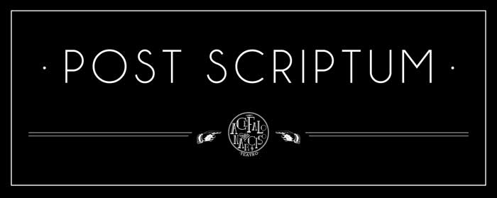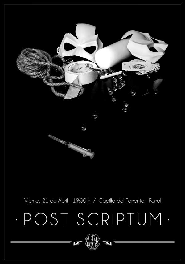 Acéfalo Narciso Teatro, la compañía leonesa de Producciones Infames, participa por segundo año consecutivo en la Semana de Poesía Salvaxe de Ferrol, que este año celebra su décima edición, con el estreno absoluto de la obra Post Scriptum. Este espectáculo tendrá lugar el viernes 21 de abril de 2017, a las 19:30 horas, en la Capilla del Centro Cultural Torrente Ballester (Ferrol).