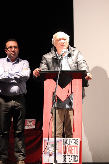 A continuación intervino Raúl Gómez que se emocionaba al contar la relación entre Pedrajas y Urones ya que el Centro Cultural Eloy Arribas, donde se desarrollaba la gala de entrega de premios, y el Corral de Anuncia, sede de los espectáculos de sala de FETAL, “se inauguraron el mismo día y a la misma hora, en marzo de 2001”. Precisamente fue en el Corral de Anuncia donde Juan Carlos Moretti dirigió a Teatro del Azar, donde se llevaron a cabo los ensayos y estrenaron Ñaque o de piojos y actores siendo así testigos de la creación de este premio. Gómez recordó que “Moretti nos enseñó muchas cosas y esa conexión entre los teatros de Pedrajas y Urones, el premio Moretti, premio Ñaque y el montaje” guardan mucha relación con aquel profesional uruguayo.