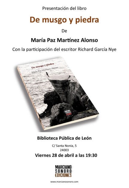 El poemario titulado “De musgo y piedra” por la referencia que hace en algunas de sus páginas al medio rural en el que se desarrolla, será desgranado este viernes día 28 de abril a las 19:30 de la tarde, en la Biblioteca pública de León (C/ Santa Nonia 5), por su autora María Paz Martínez y el escritor Richard García Nye, quién se encargó del prólogo de este libro conmovedor, que está editado por Marciano Sonoro.
