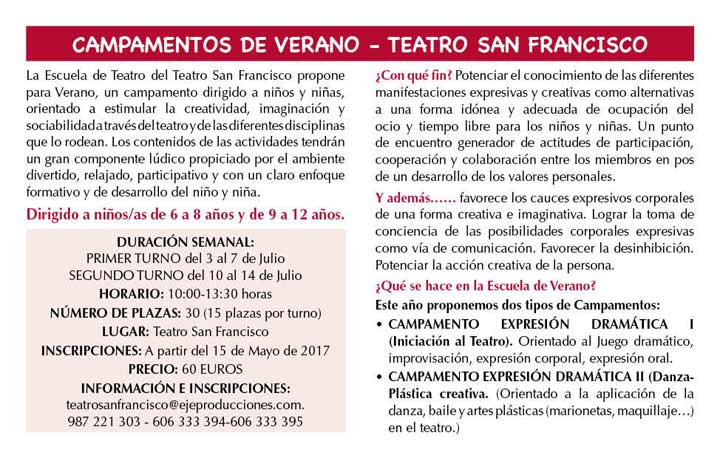 Los campamentos tendrán lugar en el Teatro San Francisco (León) por las mañanas, de 10 a 13.30 horas. El precio por los cinco días es de 60 euros y las plazas están limitadas a 15 chavales por cada turno. Para más información e inscripciones, enviar un mail a teatrosanfrancisco@ejeproducciones.com o llamar a los teléfonos que figuran en esta nota informativa: