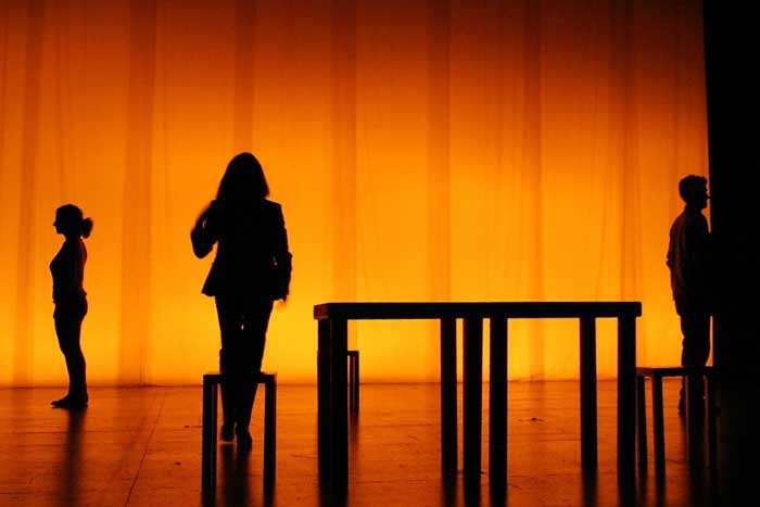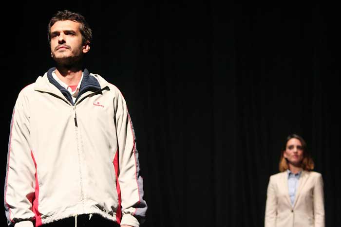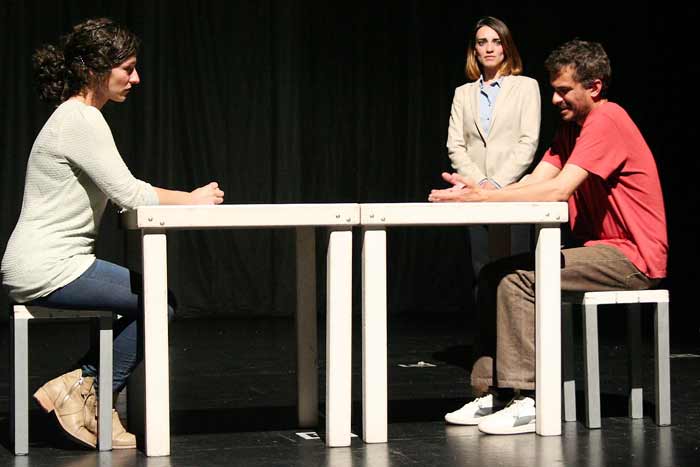 Una luz se apaga, otra se enciende. En el escenario tres personajes de espaldas, separados, al contraluz, esperan el momento cumbre. Cambia el plano, rápido, los protagonistas se dirigen uno a cada lado de la mesa. Ya están sentados, cabizbajos, de frente y sin mirarse a los ojos. Él menos que ella, desde luego. Sienten tribulación pero también determinación. Ni un paso a atrás.