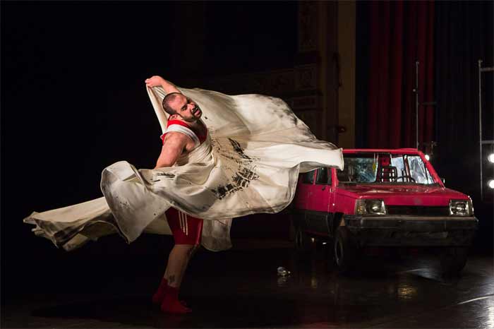 El cartel de neón «open 24 hours» que cuelga del peine del teatro y su juego de encendidos y apagados de letras, según el momento, nos puede transportar a otro lugar, espacio, cultura, aunque pronto regresamos a España, un tanto cañí, cuando nos fijamos en el Seat Panda que coloniza parte del escenario y su tuneado para la ocasión junto con el vestuario del intérprete; un chándal rojo pasión que deja que disfrutemos de este cuerpo de 120 kg que se maneja como pez en el agua por las tablas. El final de la propuesta, un tanto cinematográfica, la dejó en el aire.