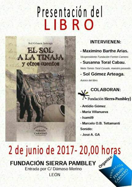 El viernes 2 de junio de 2017, a las 20 horas en la Fundación Sierra Pambley de León (entrada por calle Dámaso Merino), se presenta el libro “El sol a la tinaja y otros cuentos”, de Sol Gómez Arteaga. Acompañarán a la autora Maximino Barthe Arias y Susanna Toral Cabau. Colaboran: Antidio Gómez Carriedo, María Villanueva, Isamil9, Marcelo Óscar Barrientos Tettamanti y José A. GA.
