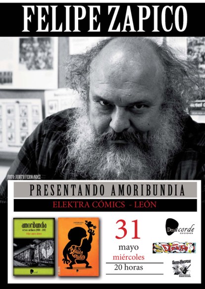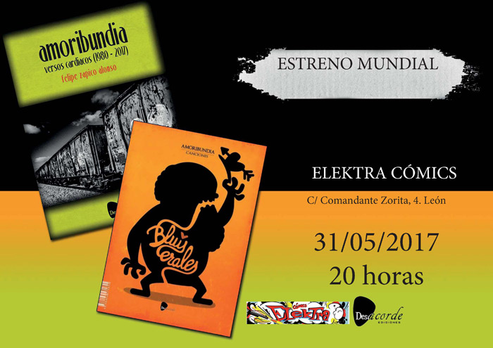 Este miércoles 31 de mayo se pone a la venta «Amoribundia, versos cardiacos (1980-2017)», un libro disco con poemas de Felipe Zapico, (que también canta nuevas canciones con su nuevo grupo Bluiscerales, junto a los guitarristas Gonzalo Ordás y Marcos Cachaldora). Con este motivo habrá una presentación especial en León, concretamente en Elektra Cómics (en Comandante Zorita, 4), este último día de mayo a las 20 horas.