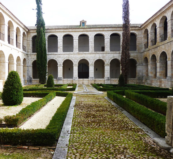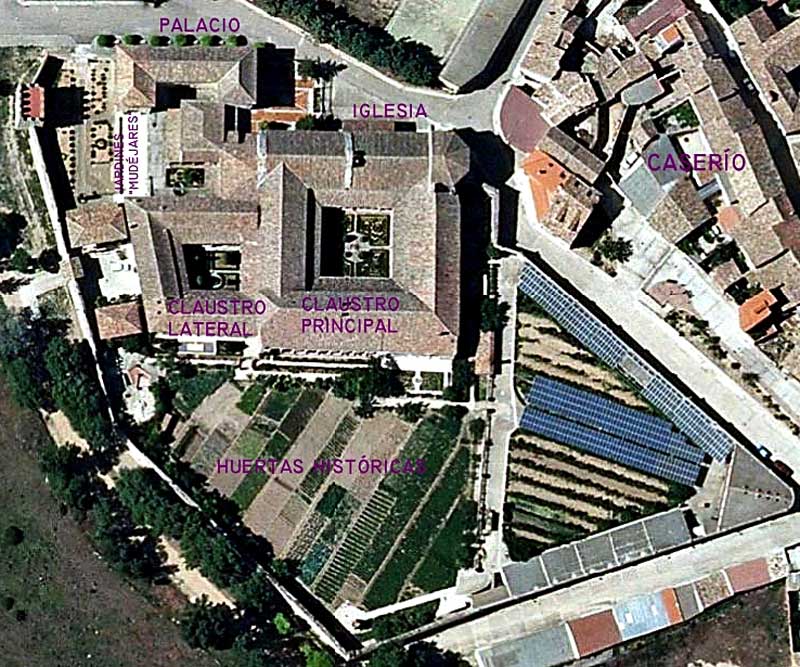Para terminar en esta visita gráfica comparativa incluimos datos del Monasterio de las Claras de Astudillo (Palencia). Una fotografía aérea ayuda a diferenciar los cuerpos edificados, claustros y huertas, estas de origen medieval del s. XIV, encerradas en una cerca. Un interesante museo con visita guiada por Sor María Avelina, permite el acceso a lo que ella denomina el jardín mudéjar, de recreación o inspiración medieval. Restos de conducciones indican instalaciones de baños, termales o de saneamiento, muy curiosas. Los claustros de clausura están cerrados a los curiosos. Los restos del palacio son escasos, siendo su portada el más significativo.