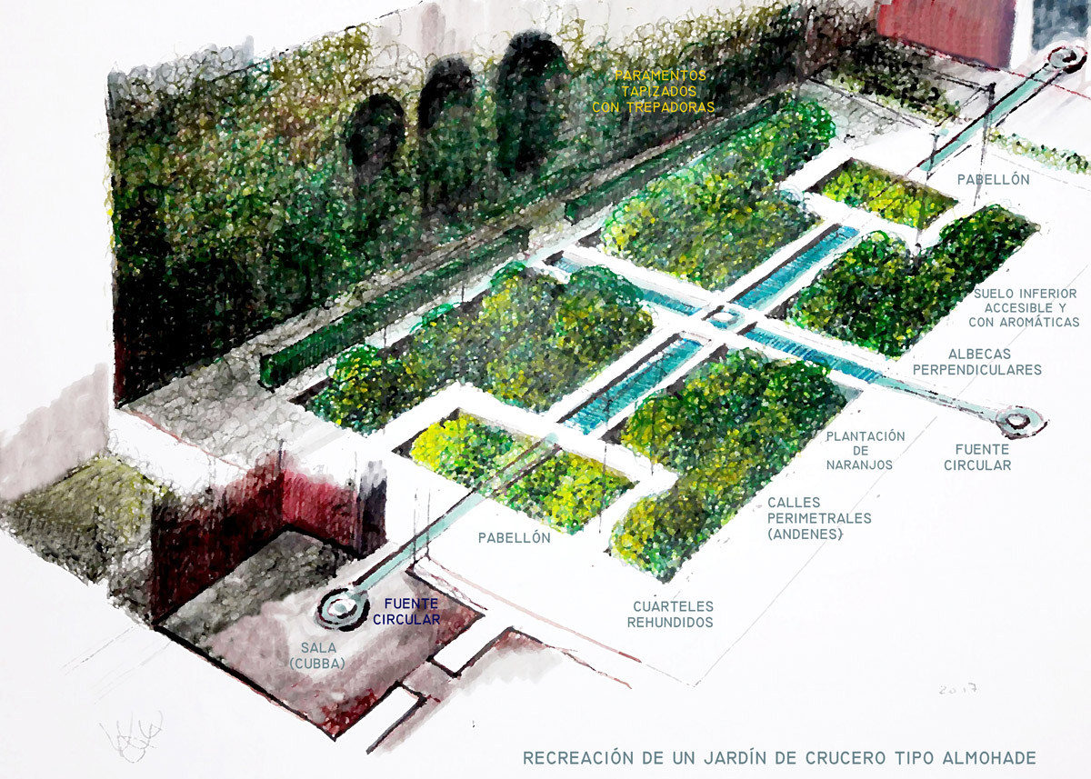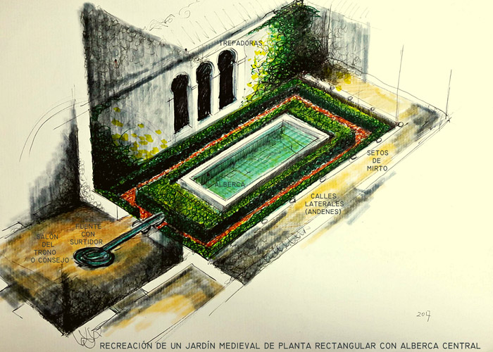 La idea que subyace es la de un jardín de crucero con una semblanza posiblemente similar a la del croquis que hemos elaborado. Quizá lo más complicado, casi imposible sea transmitir las gradaciones de los espacios de sombra, las modificaciones de estas, a lo largo del día y con variaciones de humedad y temperatura. Inefables paletas casi invisibles de grises, azulados, dorados y verdosos oliva. A veces destellos de rojos, alberos, granates y naranjas intensos, en los frutos del granado. A veces negros índigos profundos virando al negro ultramar, en lo profundo de las estancias más ocultas. Los lugares de “tu recreo”, del amor, los sueños, los susurros, los rumores, también los del agua, la intriga y la sangre.