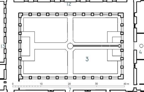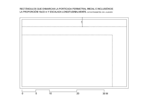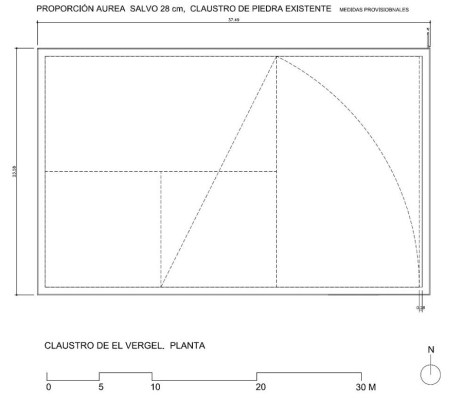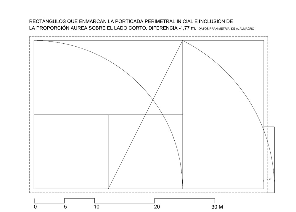 Estudiando las proporciones con la planimetría que identifica los restos de la porticada del jardín original, con más anchura y longitud, en un jardín algo mayor, según estudios de A. Almagro, tendríamos que no se ajusta a la proporción de 19×33 m ni a la Áurea, obligándonos a buscar otros modelos y otras métricas.
