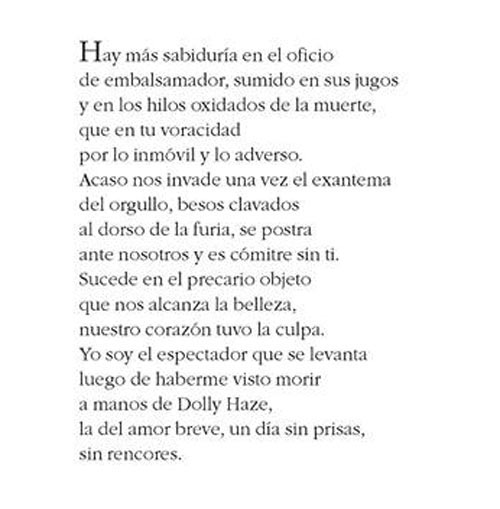Y es la palabra, es su poder extraordinario, uno de los baluartes de este libro. La palabra hurta nuestra palabra; las palabras borran las huellas de un amor para soportarlo y engrandecerlo, la palabra, y digamos ya no más, el poema, es el antepecho de la ventana desde la que contemplamos nuestros conocidos cadáveres pasar con mucha pena, y con una aleve gloria. La palabra es una ósmosis inversa que resucita tantas desnudeces como bien sabe Horacio, tantas desnudeces que se apean de su osario antiguo, y nos brindan una mirada desecha, pero una mirada.
