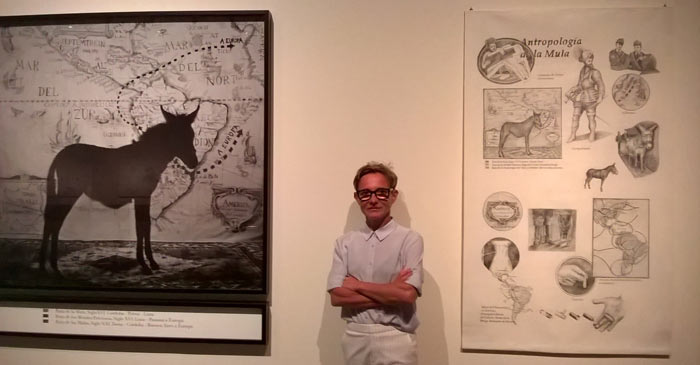 La primera,‘Antropología de la mula‘ (2007-2011), traza un paralelismo entre las rutas coloniales y las rutas del narcotráfico en América Latina. Traza un mapeo en el que intercala historias personales con la superposición de itinerarios recorridos por las mulas (animales de carga) destinadas a la explotación y exportación de metales preciosos en las minas de Potosí en la época colonial y las mulas (correos humanos de droga) en los siglos XX y XXI.