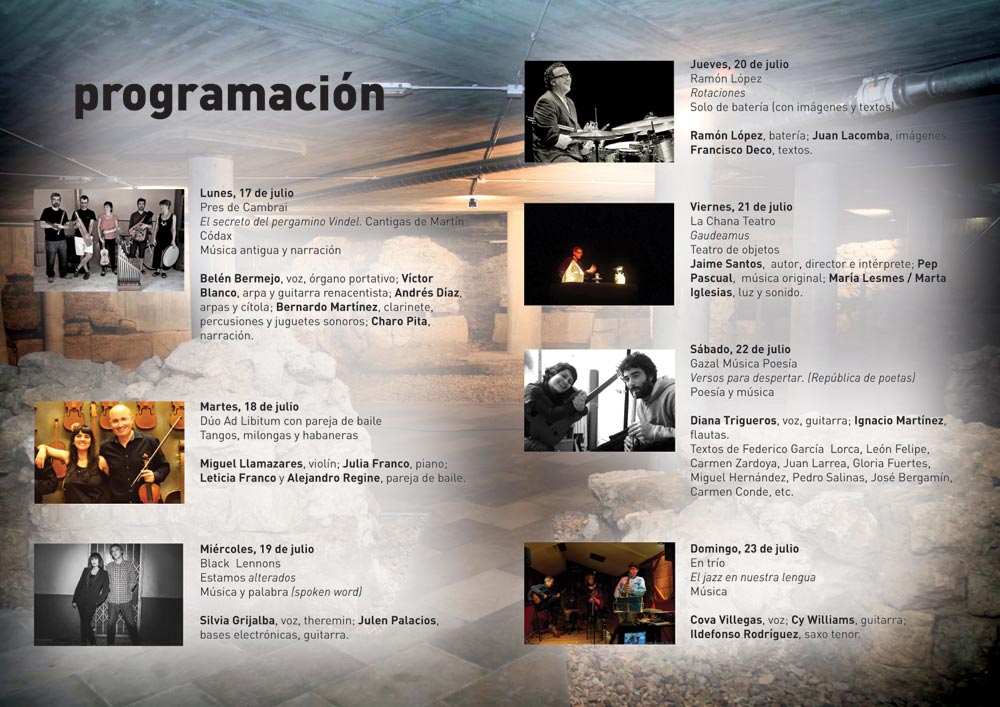 Por la cripta desfilarán, día a día, el grupo gallego Pres de Cambrai, con un espectáculo basado en las cantigas de Martin Códax (lunes 17), el Dúo Ad Libitum, con un repertorio de tangos, milongas y habaneras (martes 18), The Black Lennons y su acción de rock experimental, versos y literatura «Estamos alterados» (miércoles 19), el batería Ramón López con su espectáculo «Rotaciones» (jueves 20), La Chana Teatro y su pieza «Gaudeamus» (viernes 21), Gazal Música Poesía, el dúo de Diana Trigueros e Ignacio Martínez, cantando a los poetas españoles (sábado 22) y En trío, formación de jazz integrada por Cy Williams, Ildefonso Rodríguez y Cova Villegas (domingo 23).