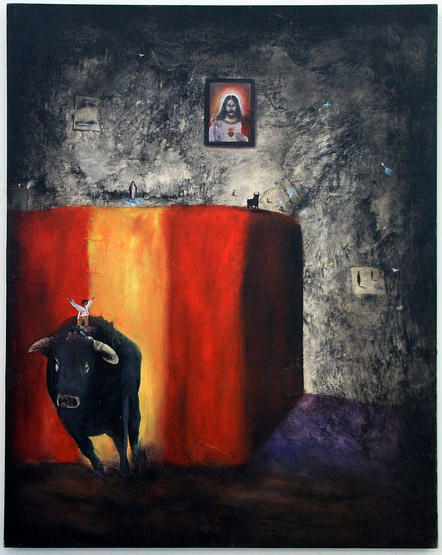 Así describe también el profesor leonés otro cuadro, el titulado «Identidad» (1994): «La asociación de la bandera monárquica con un cubo de hormigón cuya sombra se va transformando en república, con un toro, con el héroe de camisa blanca que aterrorizado grita en medio de los fusilamientos del 3 de mayo y con el corazón de Jesús son los sorprendentes ingredientes con los que expresa la desventura hispánica».
