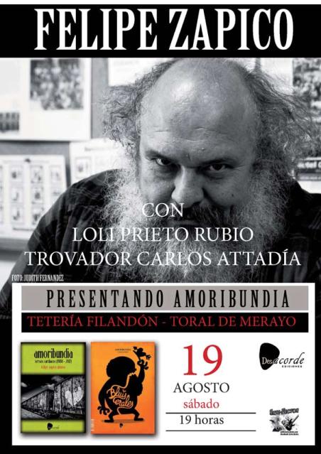 El polifacético cantante, profesor, actor, fotógrafo y poeta «anartista» leonés Felipe Zapico, fundador del mítico grupo Deicidas en los años 80, ha regresado al mundo de la música en este año 2017 con un nuevo proyecto, «Bluiscerales», en compañía de dos grandes guitarristas leoneses especializados en auténtico blues: Marcos Cachaldora y Gonzalo Ordás. Su primer libro-disco se titula «Amoribundia», y está producido por Juan Marigorta y editado por Desacorde Ediciones.