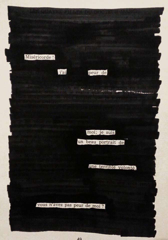 Iniciamos una nueva sección poética en TAM TAM PRESS de la mano de la joven poeta leonesa afincada en Francia Silvia Abad Montoliú, autora de «La noche que dejó de ser un animal». Bajo el título de «Poesía opaca» («blackout poetry» en inglés, «poèmes opaques» en francés…), la autora realiza un juego poético y visual de tachaduras sobre una página escrita, buscando un poema escondido a la vista. «Je joue, donc j’écris»…