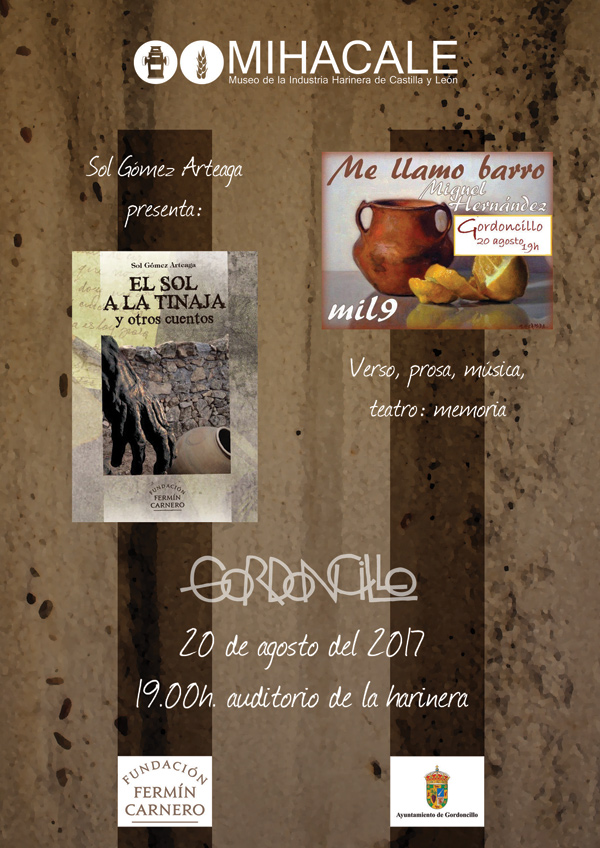 Este domingo 20 de agosto de 2017, a las 19 horas, el Museo de la Industria Harinera de Castilla y León (MIHACALE), ubicado en la localidad leonesa de Gordoncillo, acogerá la presentación del libro “El sol a la tinaja y otros cuentos”, de Sol Gómez Arteaga, junto con la representación “Me llamo Barro” del grupo literario Mil9, en torno a la figura de Miguel Hernández, cuyo 75 aniversario se cumple este año.