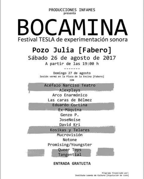 Bajo el título de BOCAMINA, y dentro del programa «Provincia TESLA», Producciones Infames ha programado dos días de actuaciones musicales, performativas y visuales en la localidad minera leonesa de Fabero: el sábado 26 de agosto en el emblemático Pozo Julia (tarde y noche), y el domingo 27 de agosto en el Parque de la Encina (a mediodía). Los espectáculos, financiados por el ILC, tienen entrada gratuita hasta completar el aforo. Se trata de una edición especial de TESLA, festival de experimentación sonora de León, que por segundo verano consecutivo busca llevar a distintos puntos de la provincia algunas de las propuestas de este festival que, desde hace tres años, se celebra en febrero en la capital leonesa.