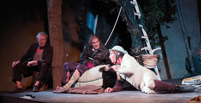 Se hace el silencio, se encienden las luces y dos vagabundos nos presentan una cruda imagen de nuestra sociedad a través del texto de Spiro Scimone titulado precisamente El Patio: la falta de trabajo, el abandono de los ancianos, la enfermedad, el hambre, el desamparo, el paso del tiempo… todo lo negativo representado en esa rata que se va comiendo todo y a la que no pueden matar; los medios de comunicación, fabuladores de historias para entretener y anestesiar al público lector.