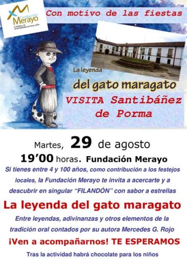 El 29 de agosto la Fundación Merayo, muy implicada culturalmente en el pueblo donde tiene su sede, la localidad leonesa de Santibáñez de Porma, y en la zona que la rodea, ha querido contribuir a la celebración de sus fiestas con un filandón que tendrá como protagonista “al gato maragato “ y su leyenda. Según señala la Fundación «se trata de ofrecer una actividad participativa en la que las personas de cualquier edad tengan cabida para su disfrute, aún mas si acuden acompañándose grandes y pequeños, aunque sin duda el mayor guiño se hace a los pequeños de la casa».