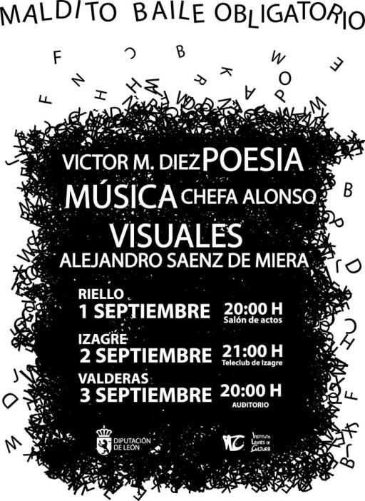 «Maldito baile obligatorio» es un espectáculo musico-poético y visual —conducido a seis manos por el poeta leonés Víctor M. Díez, la percusionista gallega Chefa Alonso y el artista Alejandro Sáenz de Miera (Alexplays)— que estos primeros días de septiembre de 2017 llegará a tres localidades de la provincia leonesa, gracias al Instituto Leonés de Cultura (ILC). El viernes 1 de septiembre (20 horas) se podrá disfrutar en el salón de actos de Riello; el sábado 2 de septiembre (21 horas) en el Teleclub de Izagre, y el domingo 3 de septiembre (20 horas) en el auditorio de Valderas. Entrada gratuita.