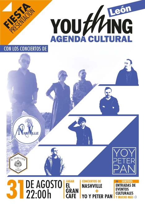 El Gran Café (León) acoge este jueves 31 de agosto, a las 22 horas, la fiesta de presentación de la nueva agenda cultural gratuita YOUTHING-León, que tendrá formato papel y digital, con tirada quincenal. Será a partir de las 22 horas, y habrá dos conciertos a cargo de los grupos Nashville y Yo y Peter Pan.