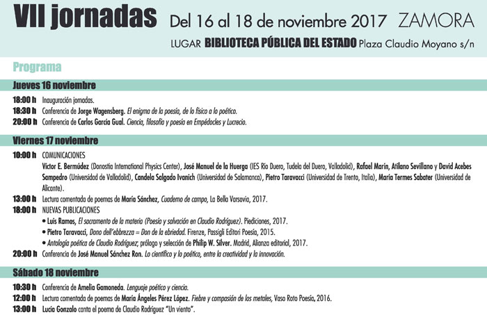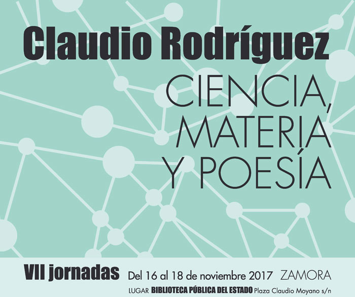 Bajo el título de «Ciencia, materia y Poesía», las VII Jornadas en torno al poeta Claudio Rodríguez se celebrarán los días 16, 17 y 18 de noviembre de 2017 en la Biblioteca Pública de Zamora, organizadas por el Seminario Permanente Claudio Rodríguez. La inscripción en estas jornadas es gratuita, pero debe formalizarse antes del 1 de noviembre. Las plazas se adjudicarán por riguroso orden de inscripción.