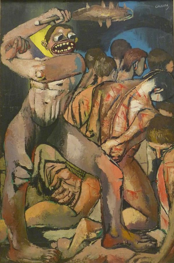 De frente, según se entra en la sala, se puede observar la brutalidad desmedida y sangrante de la aterradora escena fratricida de abigarrada y convulsa composición, creada por el destacado intelectual leonés, Luis Sáenz de la Calzada (León 1912-1994). Poeta, actor y creador surrealista amigo de Federico García Lorca y miembro de la Barraca. Obra descarnada y cruenta que lleva por título Caín y Abel, escena trágica que simboliza la primera y más terrible de todas las guerras.