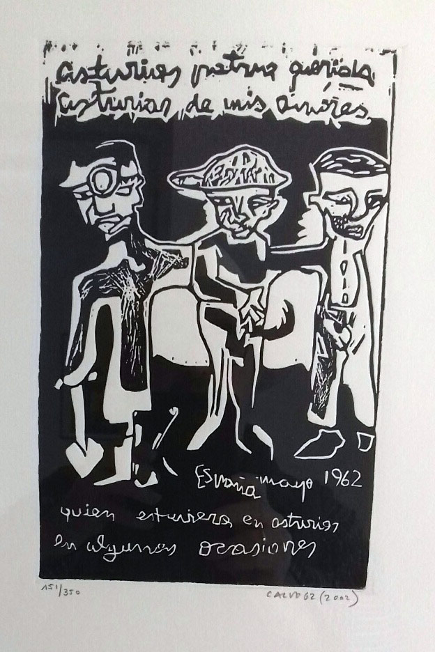 La obra gráfica del destacado creador Manuel Calvo Abad (Oviedo 1934), Asturies o Quién estuviera en Asturias…. Un sencillo pero expresivo linograbado de 1962, reeditado por el propio artista y la grabadora leonesa Noemi Álvarez, con motivo de la muestra Hay una Luz en Asturias, la Huelga de 1962; producida por la Fundación Muñiz Zapico en el año 2002 y comisariada por el reconocido crítico Francisco Zapico. Esta obra se incorpora a la muestra como una sencilla cita histórica y al mismo tiempo como homenaje y reconocimiento al compromiso de los mineros de la comarca, que se unieron en la lucha, junto con los de Villablino, en la tremenda y durísima huelga minera en Asturias de 1962, denominada La Guelgona, surgida en el grupo Nicolasa de Fábrica de Mieres el 7 de abril, que produjo terribles represalias a los obreros y sus familias, hecho que supuso un intenso revulsivo creativo entre numerosos y destacados artistas como el propio Pablo Picasso, Eduardo Úrculo, o Eduardo Arroyo.