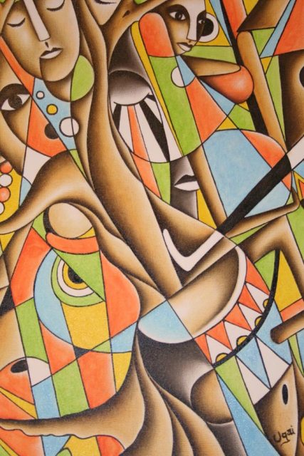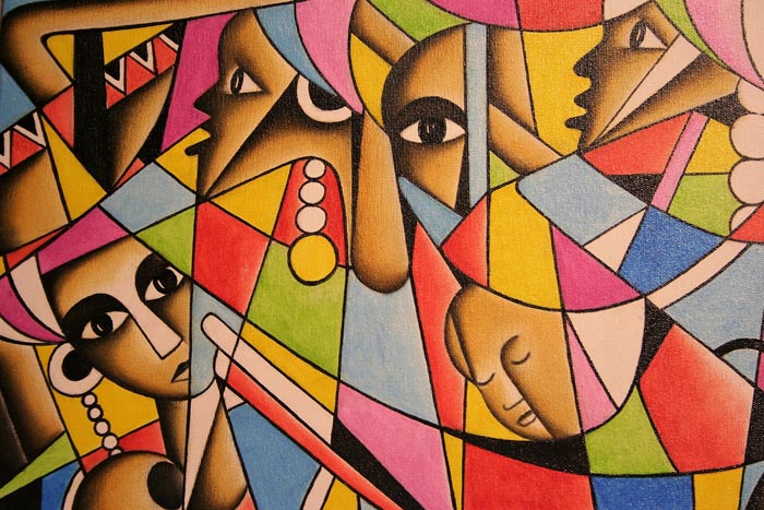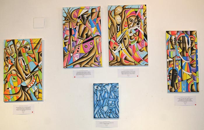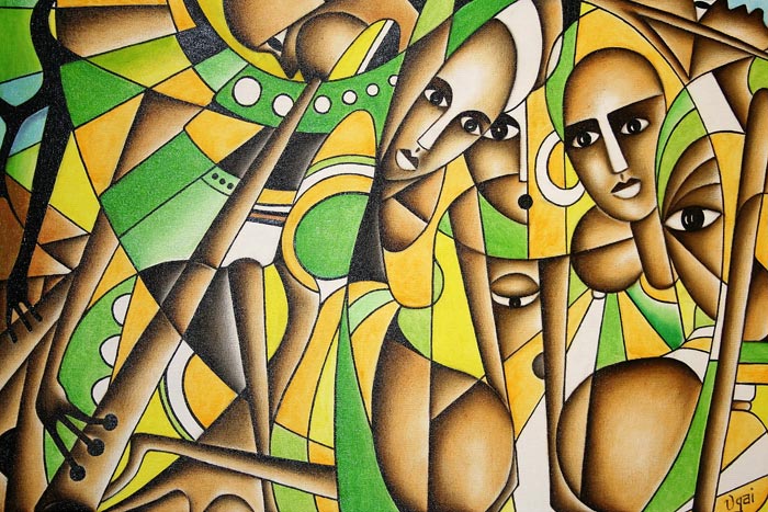 Esta enumeración de temas resumen algunas de las propuestas pictóricas, basadas en la tradición, que el pintor gambiano Yusupha Gai presenta en el bar-restaurante Puerto Chico (C/Nicasio Pérez, 1, Valladolid), bajo el título Mama Africa. Gran parte de los cuadros, construidos a base de vivos colores, con tintes cubistas, tienen a las muchachas y mujeres africanas como protagonistas de la larga docena de historias que cuelgan de las paredes de este espacio, a caballo entre la hostelería y la galería artística.