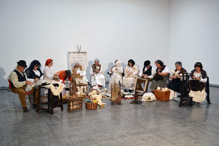 También se presentan dos series de fotografías y diferentes clases de sillas, escaños y tablas, normalmente autoconstruidas y comunes en el ámbito rural, utilizadas habitualmente como espacios de reunión y conversación en los que se juntan mujeres y hombres, generalmente al atardecer. Y se puede ver una pieza en vídeo en la que el grupo ‘Bolvoreta Fiandeira’ de Lugo aparece realizando las diferentes acciones que desempeñaban las mujeres en el filandón tradicional, tales como cardar, torcer, hilar y tejer. De este modo se pretende remitir a una actividad que, si bien ha desaparecido prácticamente de los hogares rurales en su forma tradicional, puede sin embargo pervivir, hibridada con nuevas formas de prácticas colaborativas desarrolladas por las mujeres hoy en día.