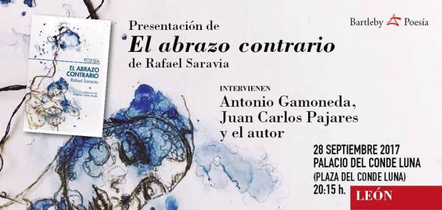 Este jueves 28 de septiembre, en el Palacio del Conde Luna (León), se presentará el libro de poesía “El abrazo contrario” (Bartleby Editores), del escritor leonés Rafael Saravia. En la presentación, a partir de las 20,15 horas, intervendrán, junto al autor, los poetas Antonio Gamoneda y Juan Carlos Pajares. Entrada libre.