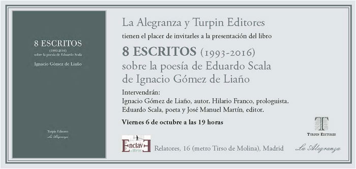 Este viernes 6 de octubre se presenta en Madrid el libro «8 Escritos (1993-2016) sobre la poesía de Eduardo Scala» (Turpin Editores), del que es autor Ignacio Gómez de Liaño. La presentación tendrá lugar a las 19 horas en Enclave de Libros (C/ Relatores, 16, metro Tirso de Molina), y contará con la participación de Ignacio Gómez de Liaño (autor), Hilario Franco (prologuista), Eduardo Scala (poeta) y José Manuel Martín (editor).