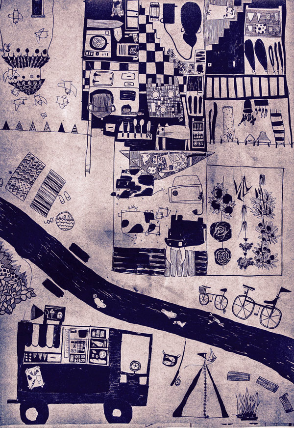 es el juego de las casitas, la rayuela, la cartografía del sueño: mapa plano: escuela, cementerio (¿quién fue Bachi?), mundo plano, cigüeña en el campanario, el corral, el tendal, el palomar, en la casa no falta la máquina de coser y el gato que desmadeja