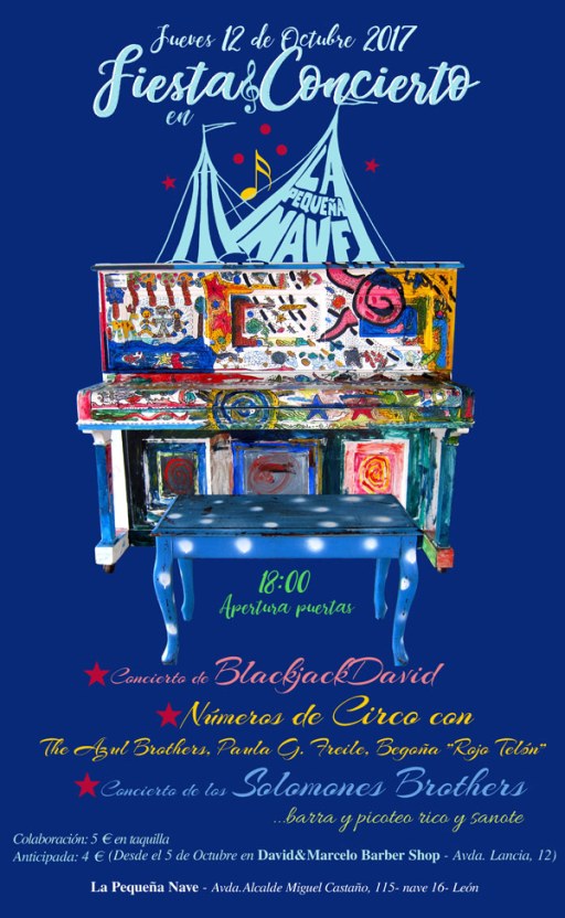 La Escuela de Circo de León “La Pequeña Nave” se llena de música y circo para celebrar el inicio de curso. El evento tendrá lugar este jueves 12 de octubre en horario de tarde: desde las 18:45 (con apertura de puertas a las 18:00). Habrá números de circo, humor y malabares con The Azul Brothers, telas aéreas con Begoña (Rojo Telón), música en directo con BlackJackDavid y Los Solomones, bailoteo, barra y picoteo rico y sanote, buen ambiente… La cuota de colaboración con el espacio es de 5€ en taquilla y 4€ anticipada.