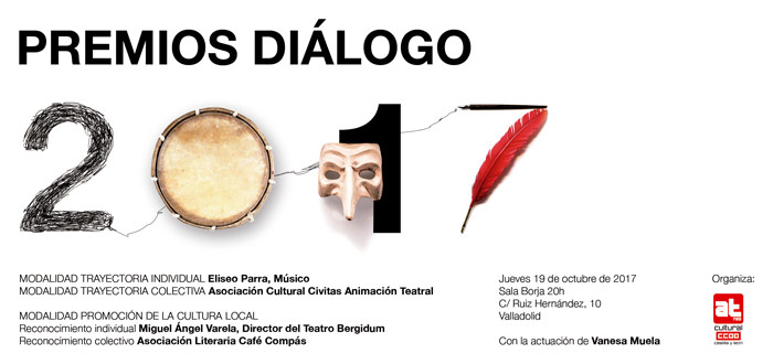 El músico Eliseo Parra, el director del Teatro Bergidum de Ponferrada Miguel Ángel Varela, y las asociaciones culturales Cívitas Animación Teatral (Ciudad Rodrigo) y Café Compás (Valladolid) recogerán los «Premios Diálogo 2017» que concede el Ateneo Cultural Jesús Pereda (CCOO) durante una Gala que tendrá lugar el jueves 19 de octubre, a las 20 horas, en la Sala Borja de Valladolid.