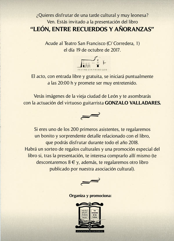 1-Contraportada-invitación 15 de octubre de 2017 Return to: «León, entre recuerdos y añoranzas», un libro de fotografías de Gregorio Fernández CastañónMáxima resolución (600 × 831) Image navigation Siguiente imagen ...